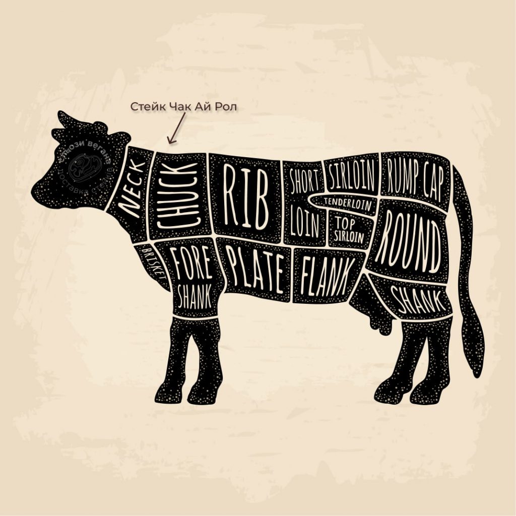 Чак Ай Рол недорога альтернатива стейку Рібай. Це досить бюджетний, при цьому дуже ніжний стейк із приємним насиченим запахом. М’ясо відрізняється гарною мармуровістю та округлою формою відрубу. Не такий жирний, як Рибай, але точно не поступається йому за насиченістю смаку та аромату.