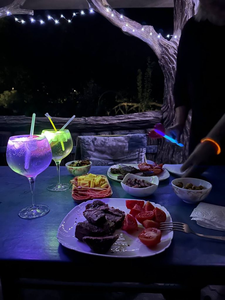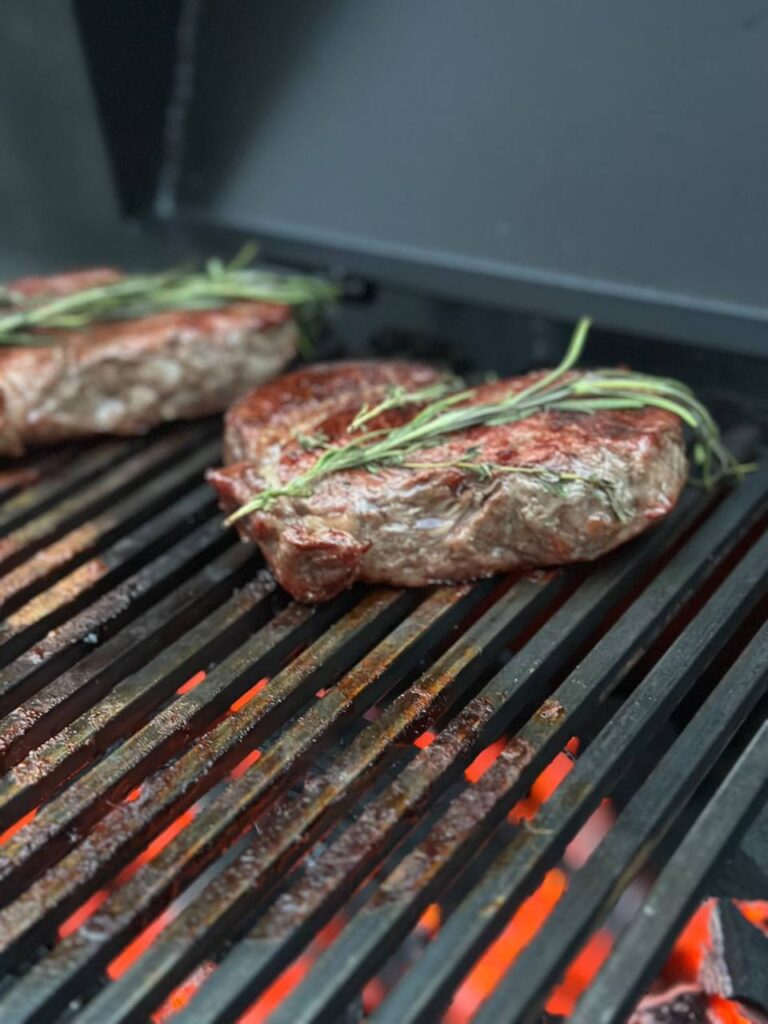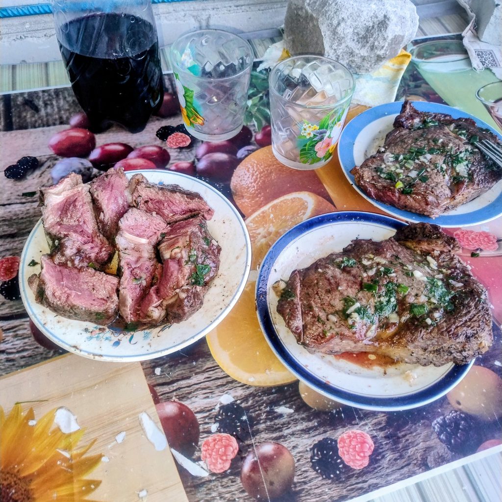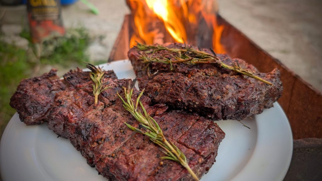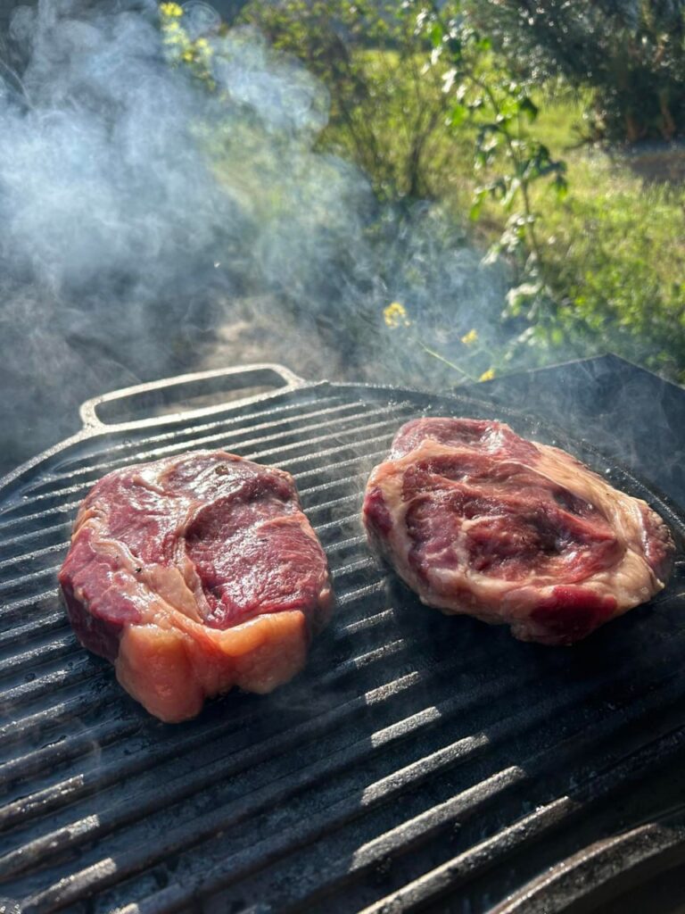 Стейк готували на вуглях на мангалі, поряд відкрите полум’я, вийшло дуже смачно.