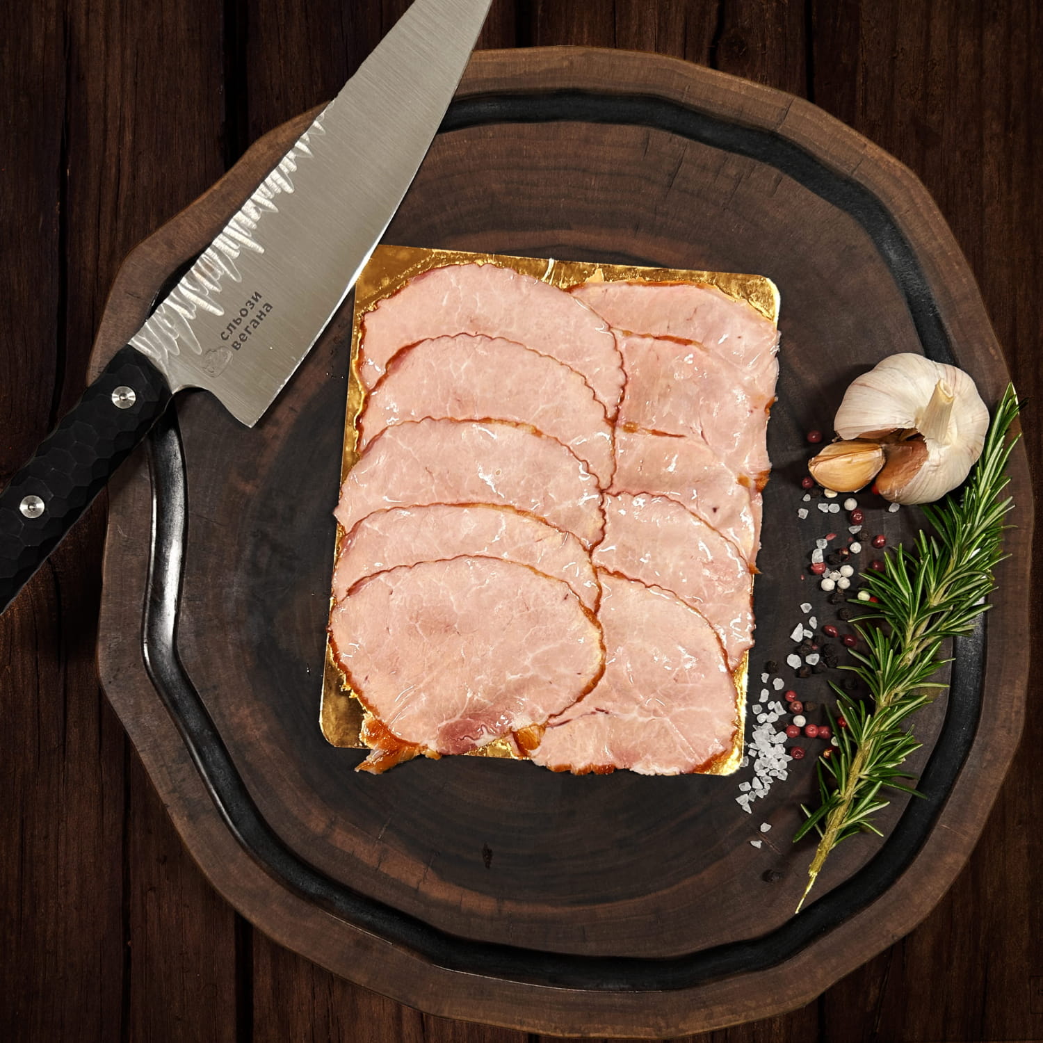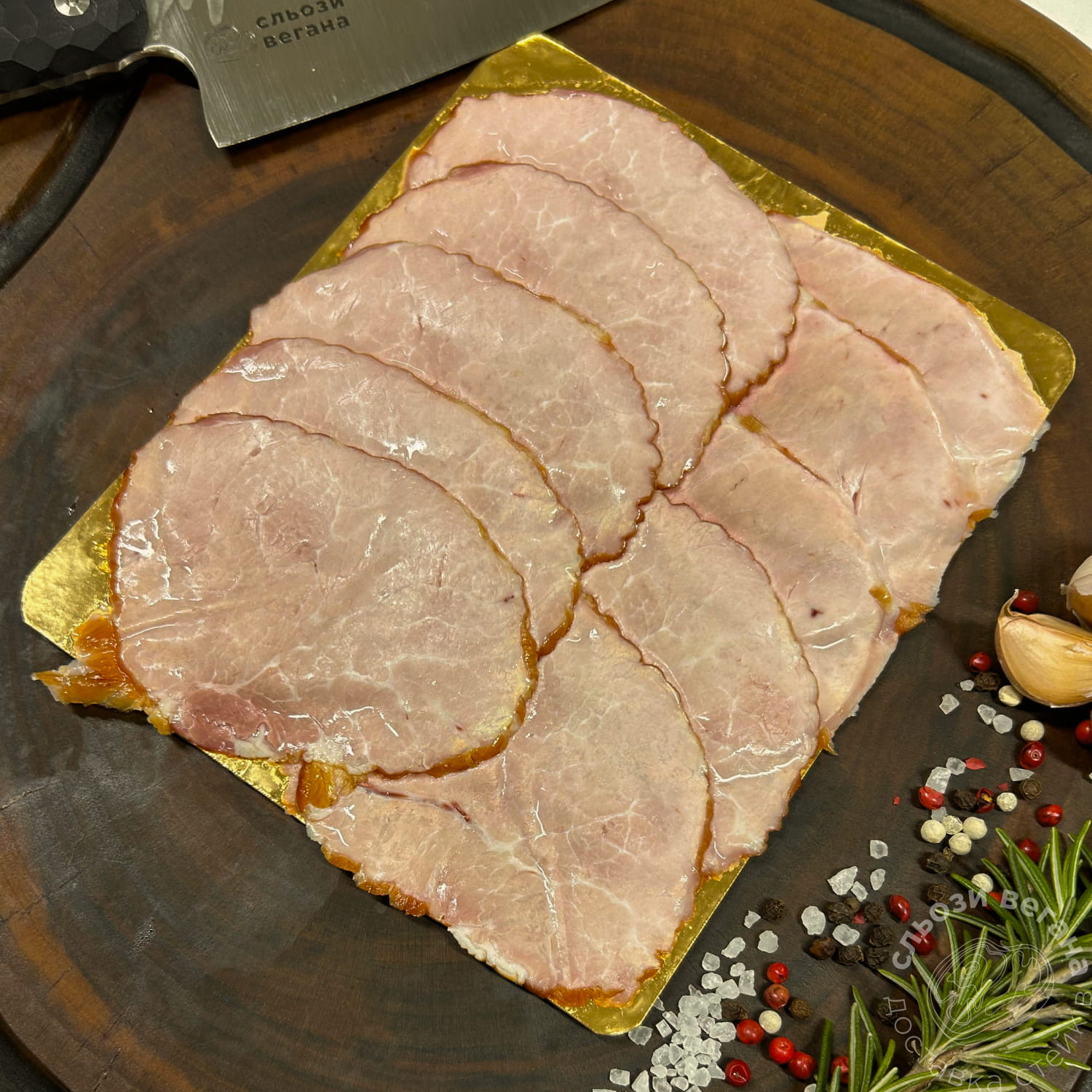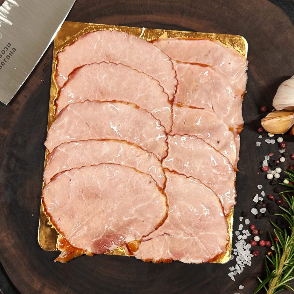 Основа хорошей копченой ветчины – правильно подобранное мясо, деликатное соление, выверенный баланс специй и аккуратное копчение, не перебивающее естественный вкус, а подчеркивающее его. Именно поэтому ветчина получается не резкой, не пересушенной и не слишком соленой. Она сохраняет естественную сочность, имеет приятную упругую текстуру, легко режется тонкими слайсами и красиво смотрится в подаче. Каждый кусок сочетает плотность хорошей мясной структуры и мягкость, благодаря которой ветчина смакует и самостоятельно, и в составе разных блюд.